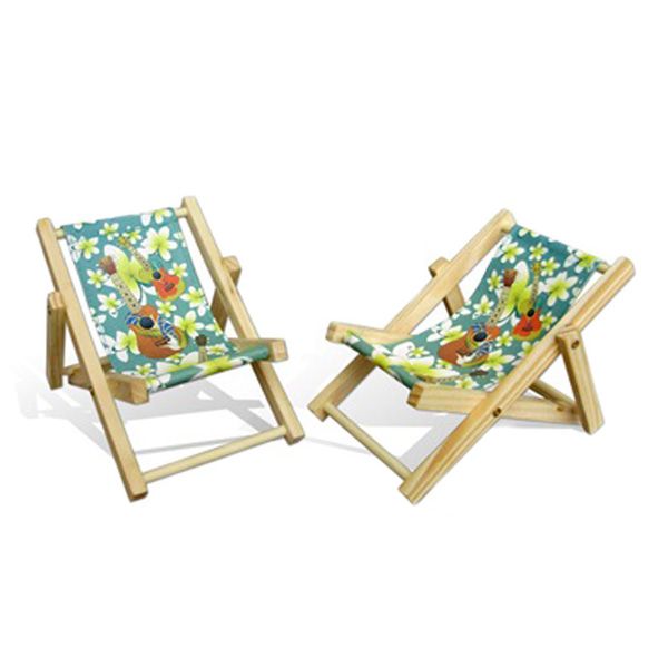 "Wooden frame mini beach chair to hold your cell phone and business cards, in full color."
